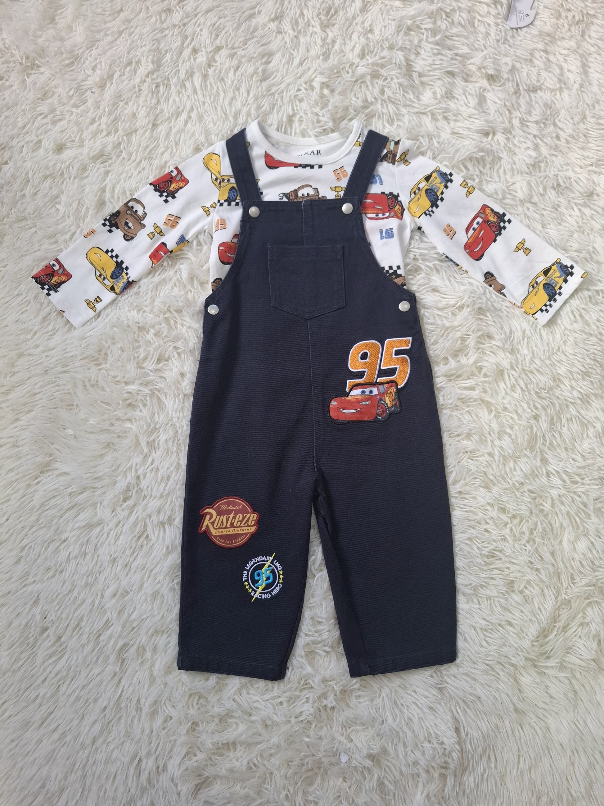 Incluye una camiseta blanca de manga larga con divertidos estampados de los personajes de la película y un overol de lona azul marino con aplicaciones bordadas del número 95, Rust-eze y enLightning McQueen.